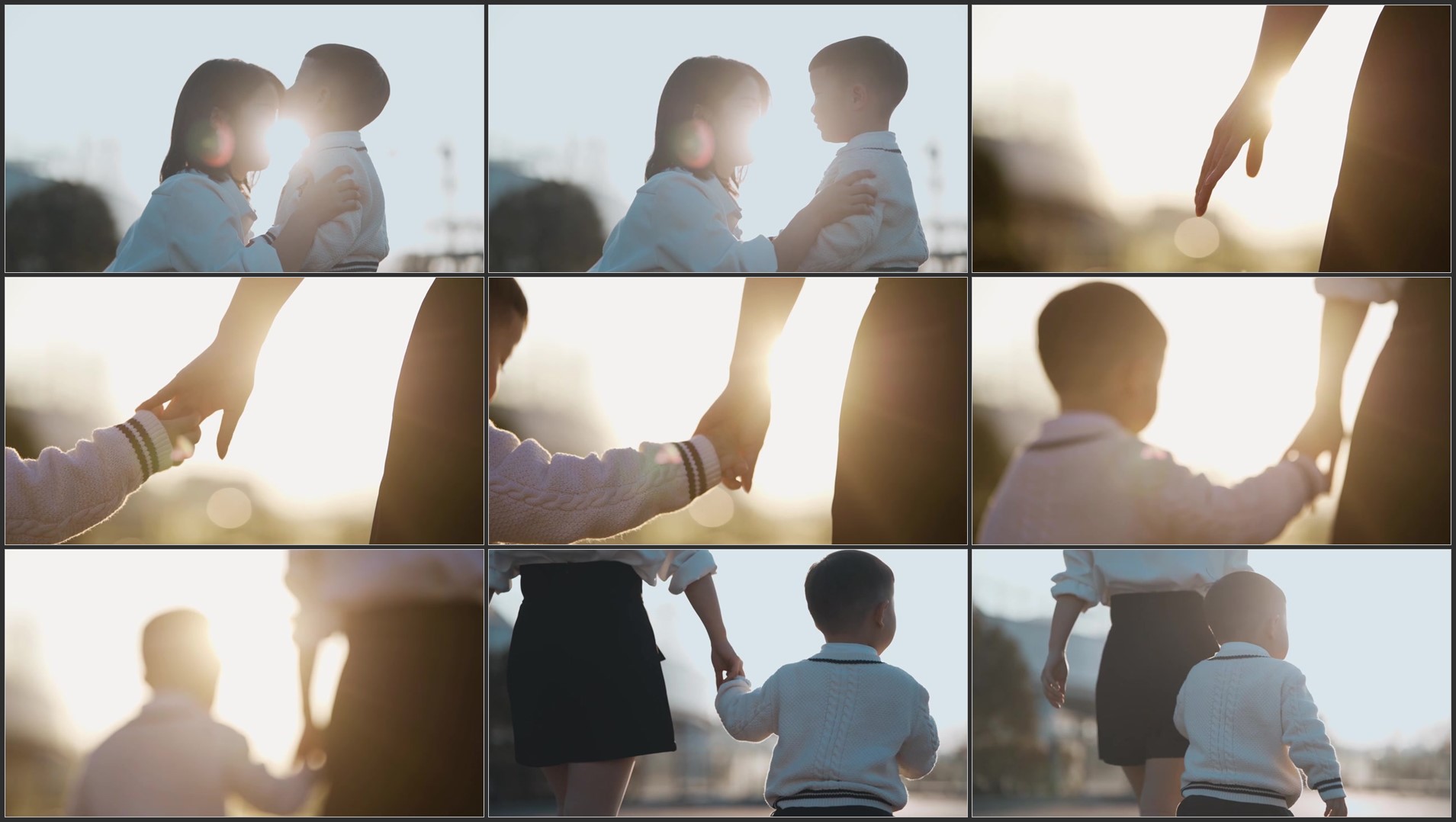 温馨亲子视频大手拉小手逆光亲吻额头母亲节