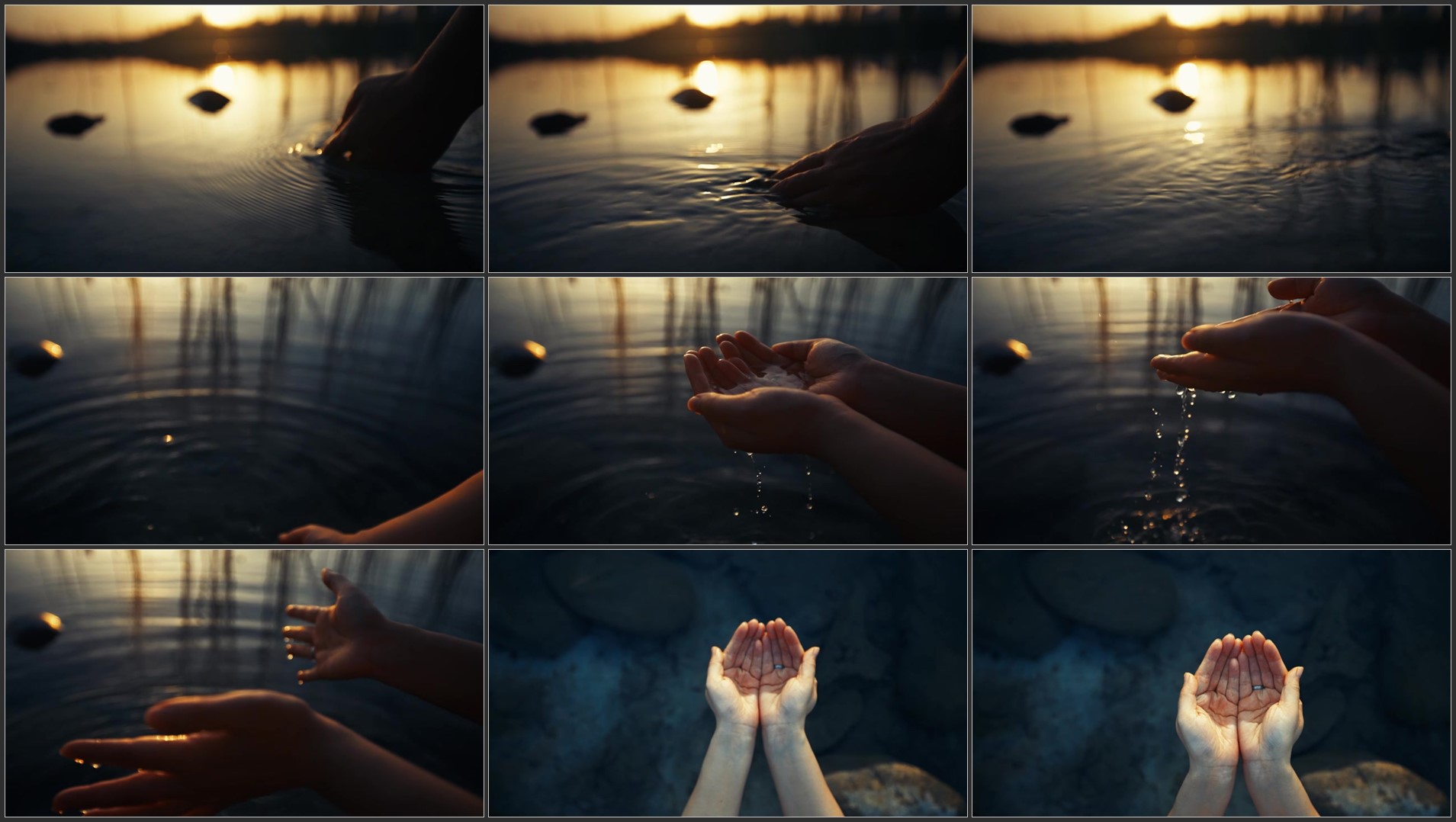 黄昏逆光湖面特写手划过水面意境空镜头视频