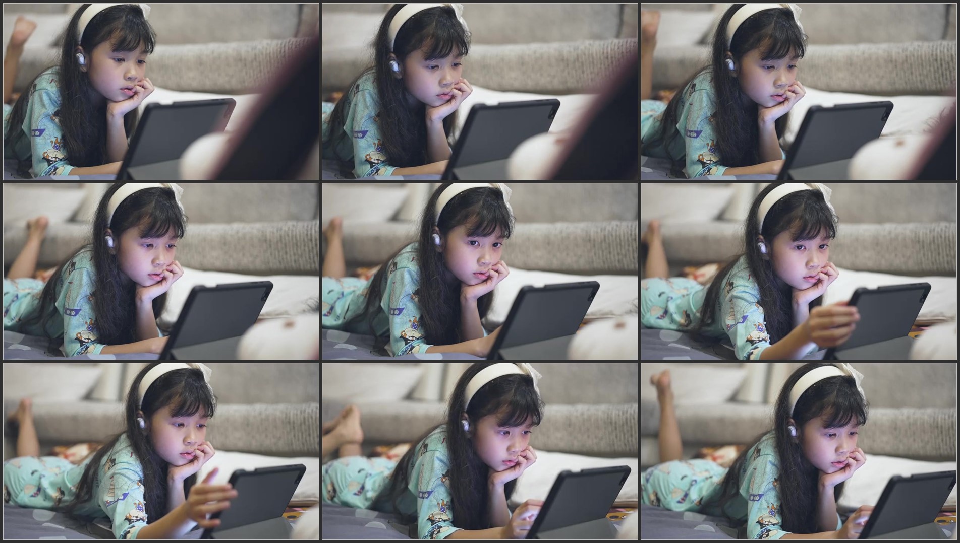 小女孩晚上在卧室玩数字平板电脑在线学习.